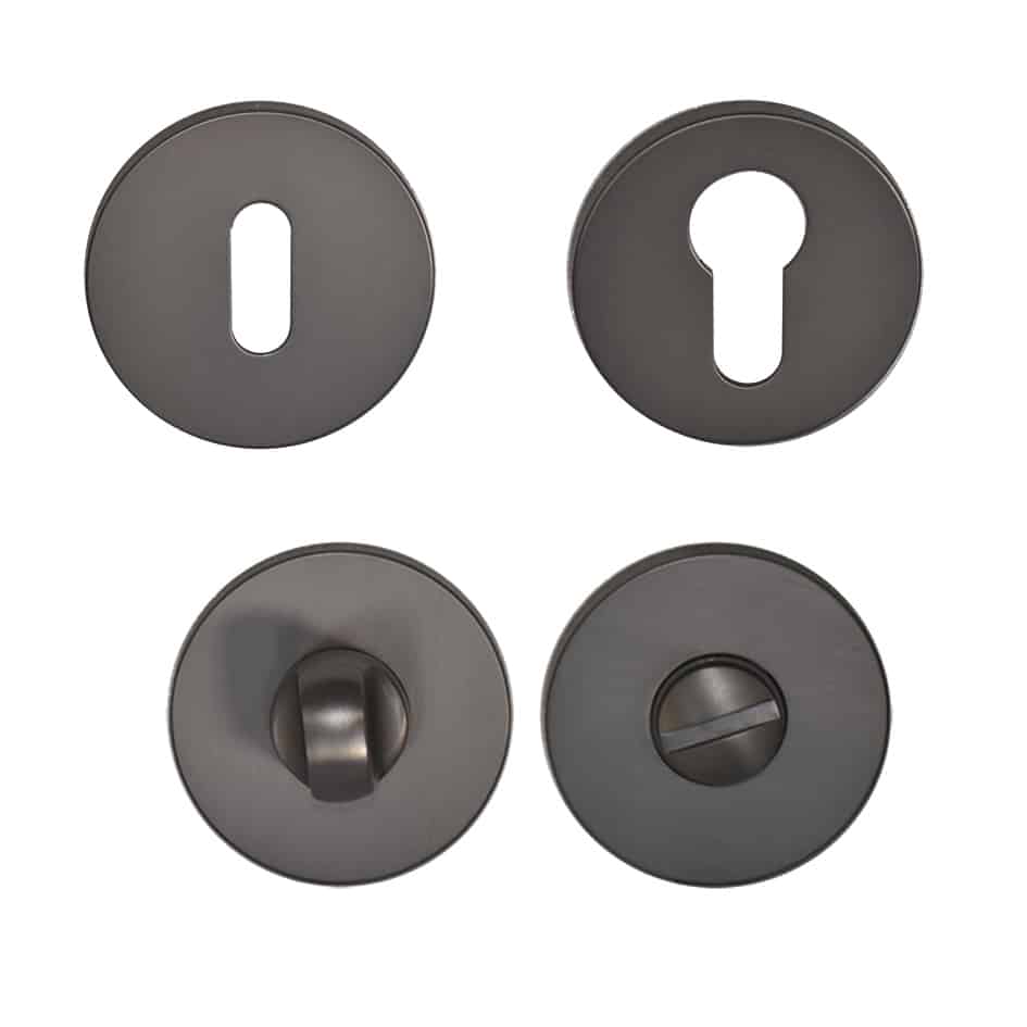 •  Poignée massive avec ressort de rappel sur rosace ronde fine à clipser sur sous-construction en nylon