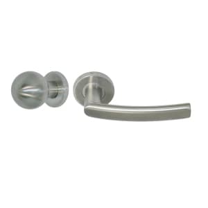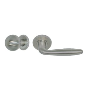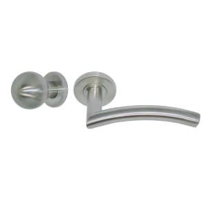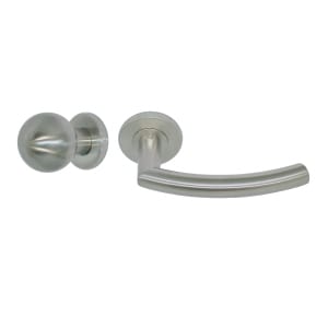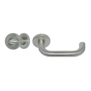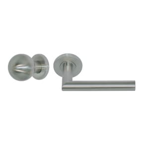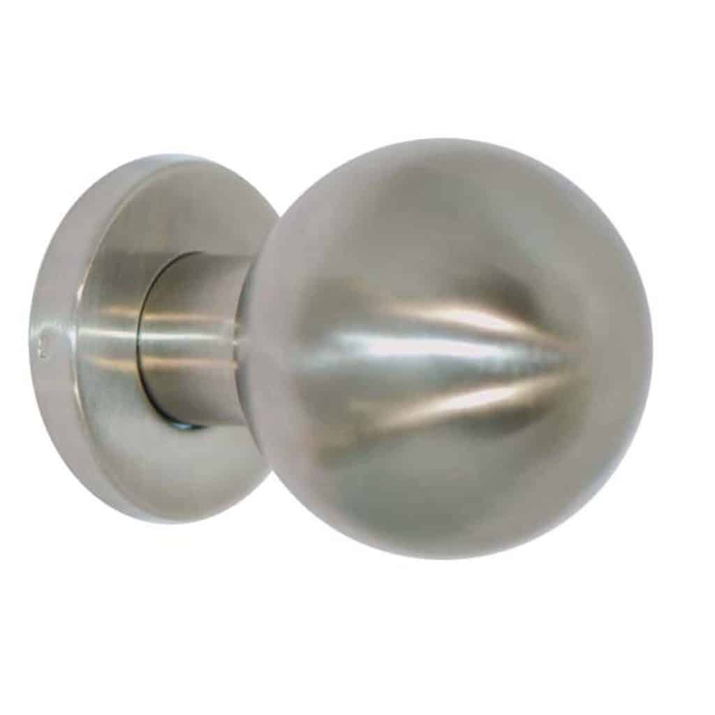 Boule fixe en inox brossé mat sur rosace ronde, pouvant servir de centre de porte ou être coordonnée à l’une de nos poignées en inox