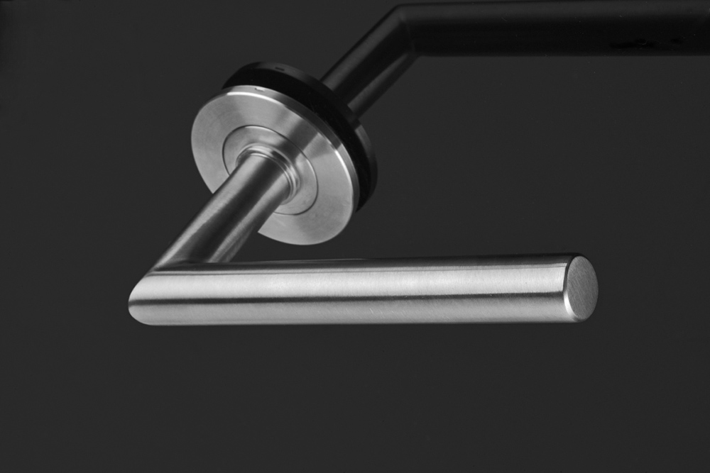 La poignée en angle droit à section ronde fine (D.16mm) est monté sans ressort sur rosace ronde fine (épaisseur 4mm)
