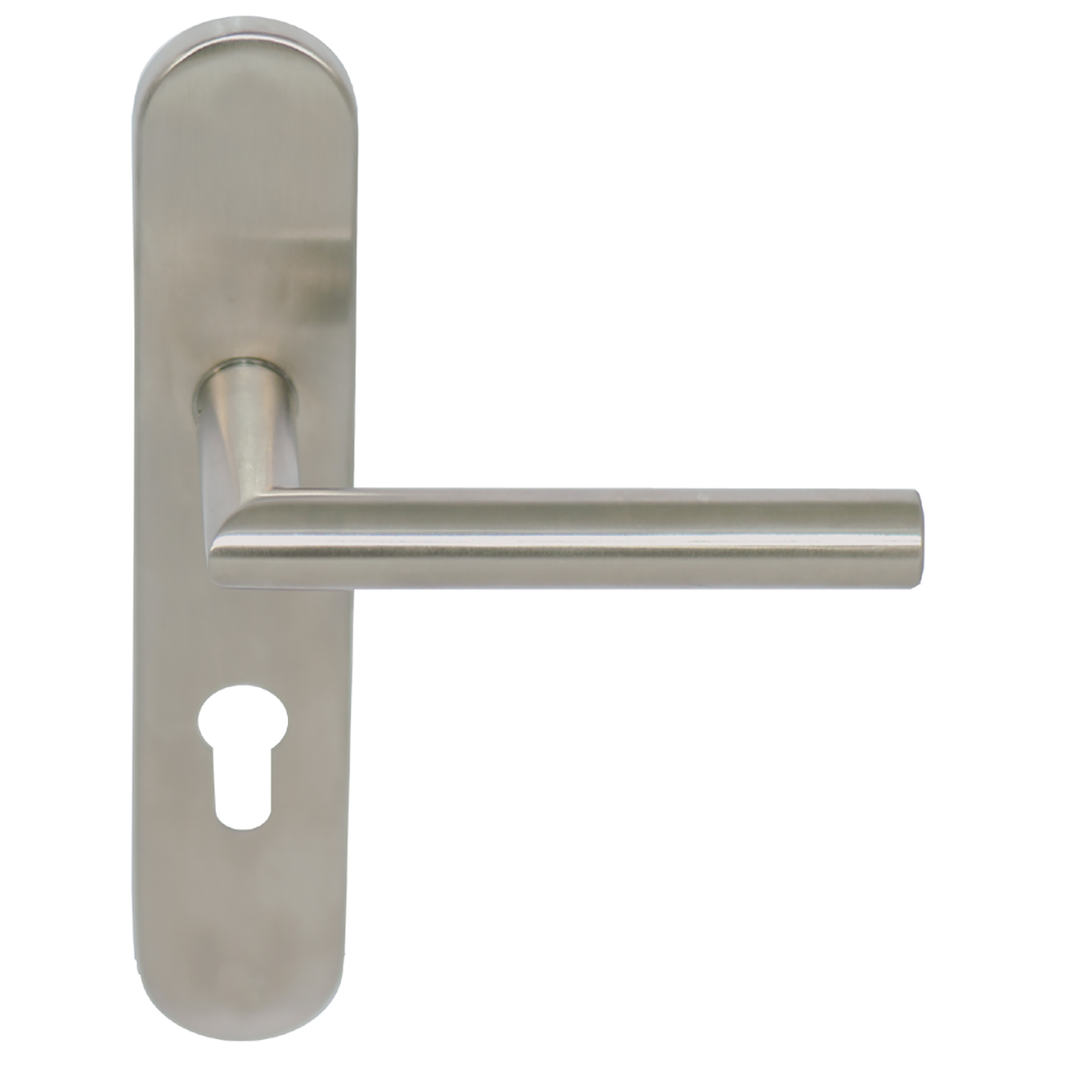Poignée tubulaire à angle vif sur grande plaque (fixation 195mm) avec ressort de rappel et avec piliers pour un maintien renforcé.