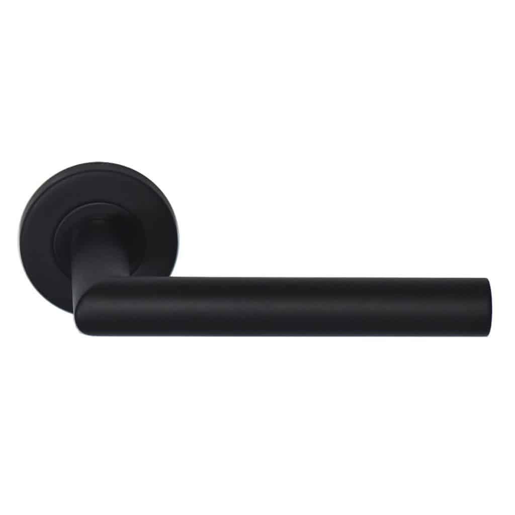 Poignée de porte décorative en inox finition noire à section tubulaire sur rosace ronde .
