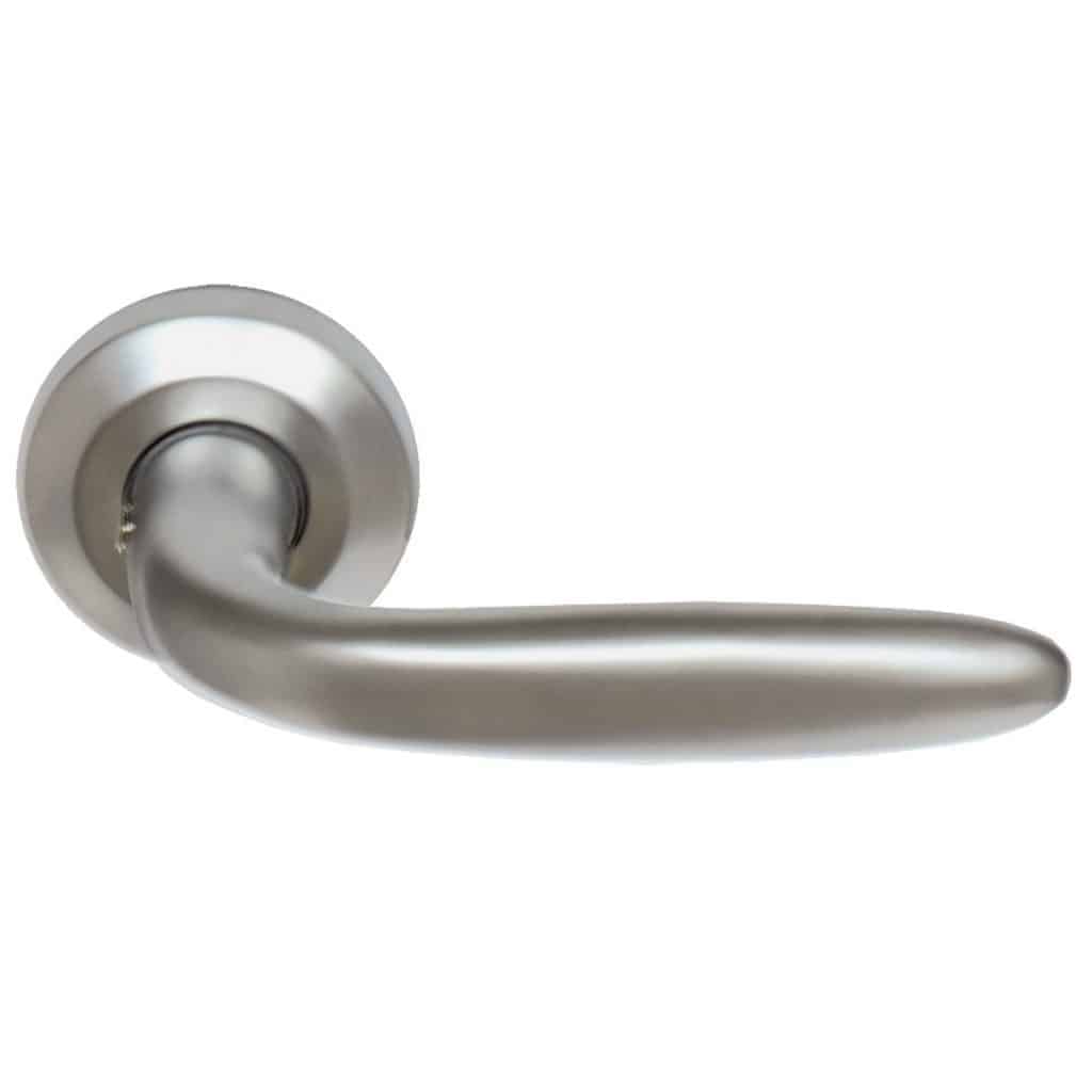 Poignée de porte avec ressort de rappel sur rosace ronde biseautée, montée sur sous-rosace avec piliers en nylon.