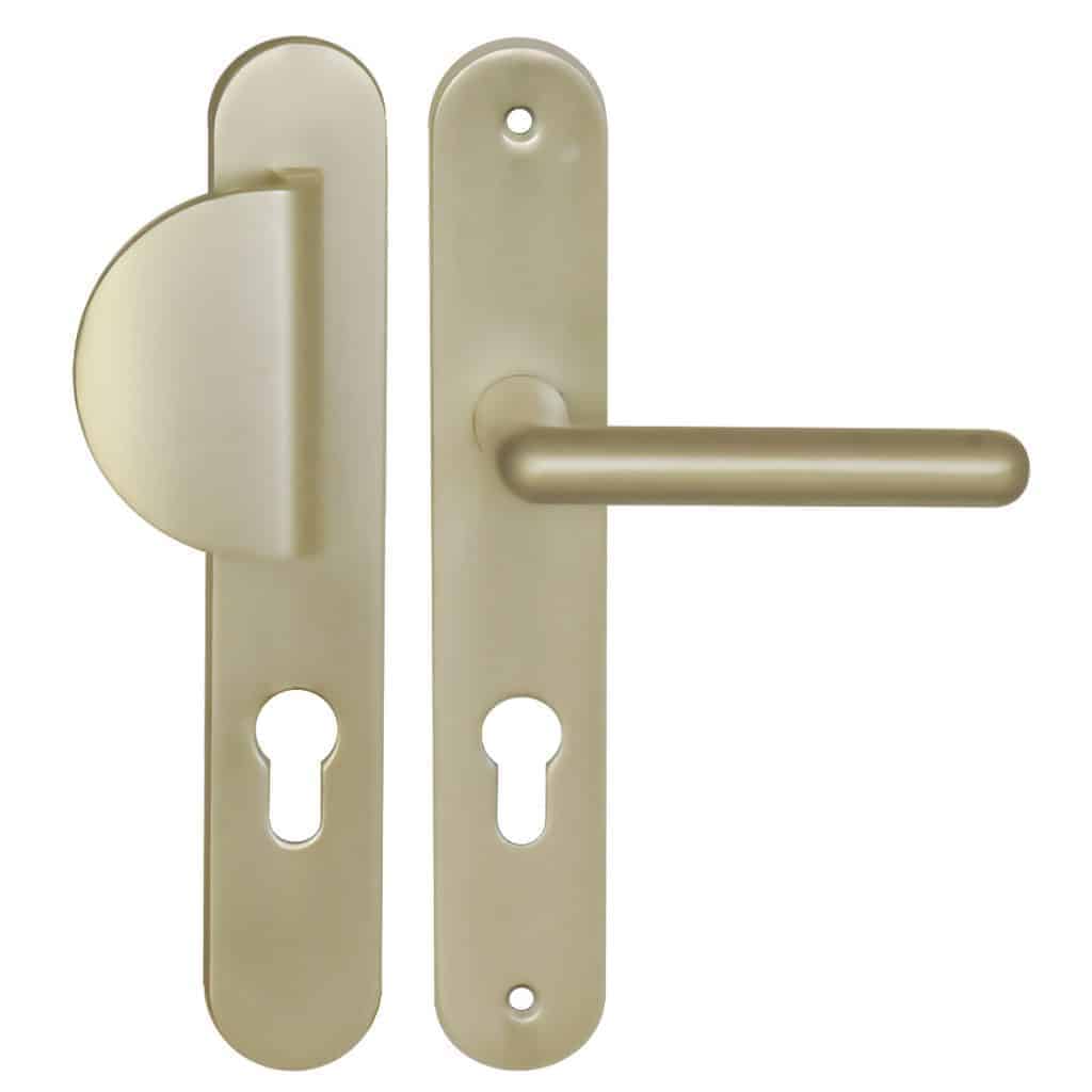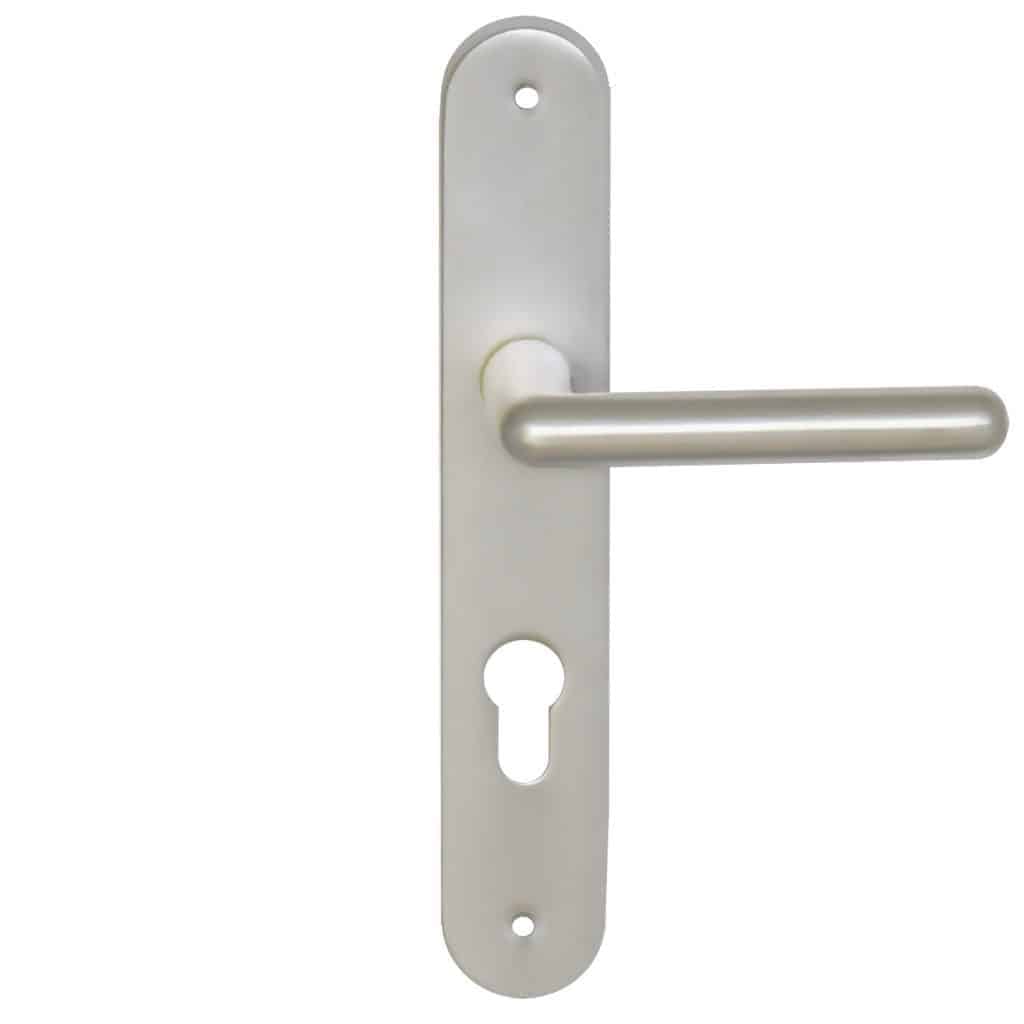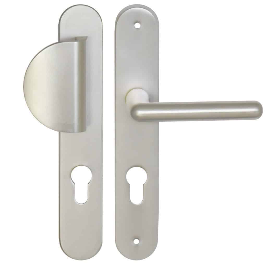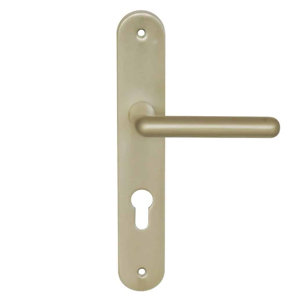 Poignée en aluminium Argent ou Champagne en angle droit à section ronde, sans ressort de rappel, sur grande plaque emboutie ea.195mm.