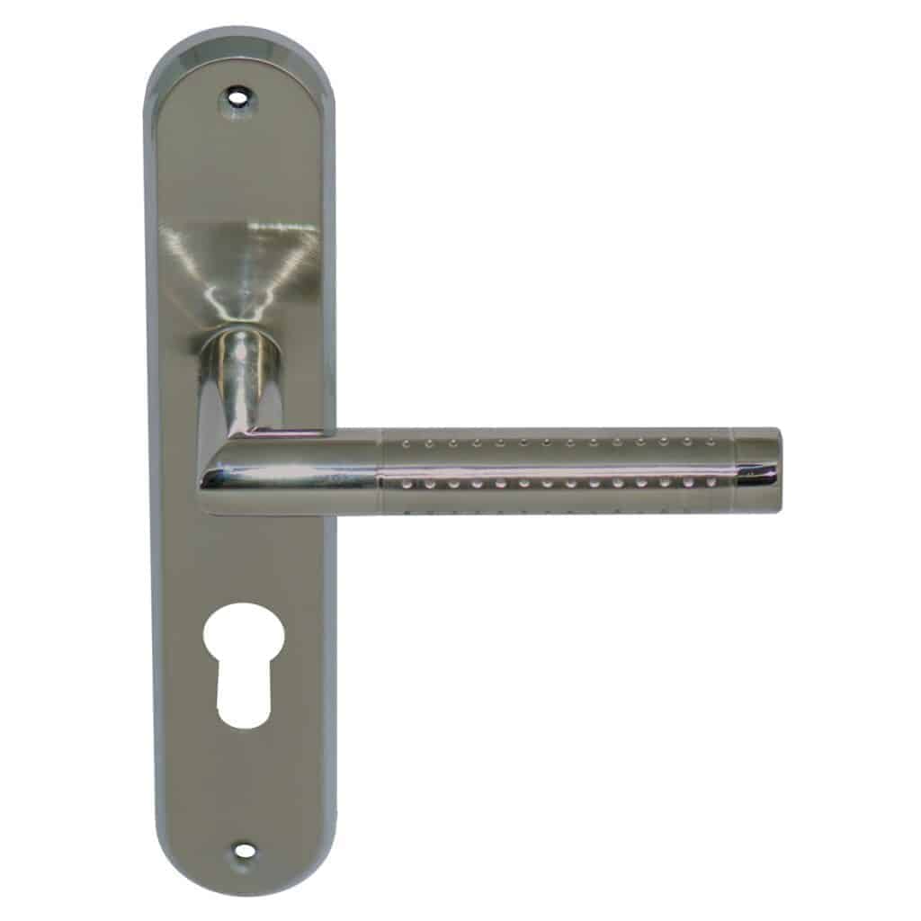 Poignée de porte en angle droit en inox bicolore brillant et mat, décorée de poinçons, sans ressort de rappel sur grande plaque biseautée ea.195.