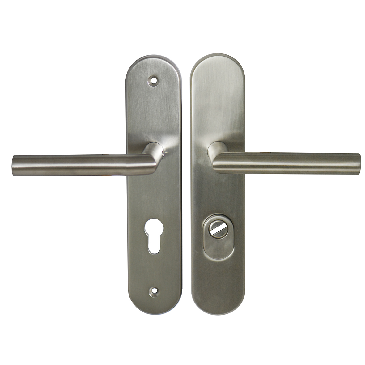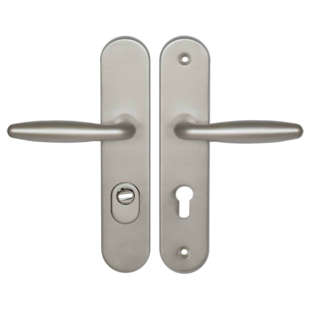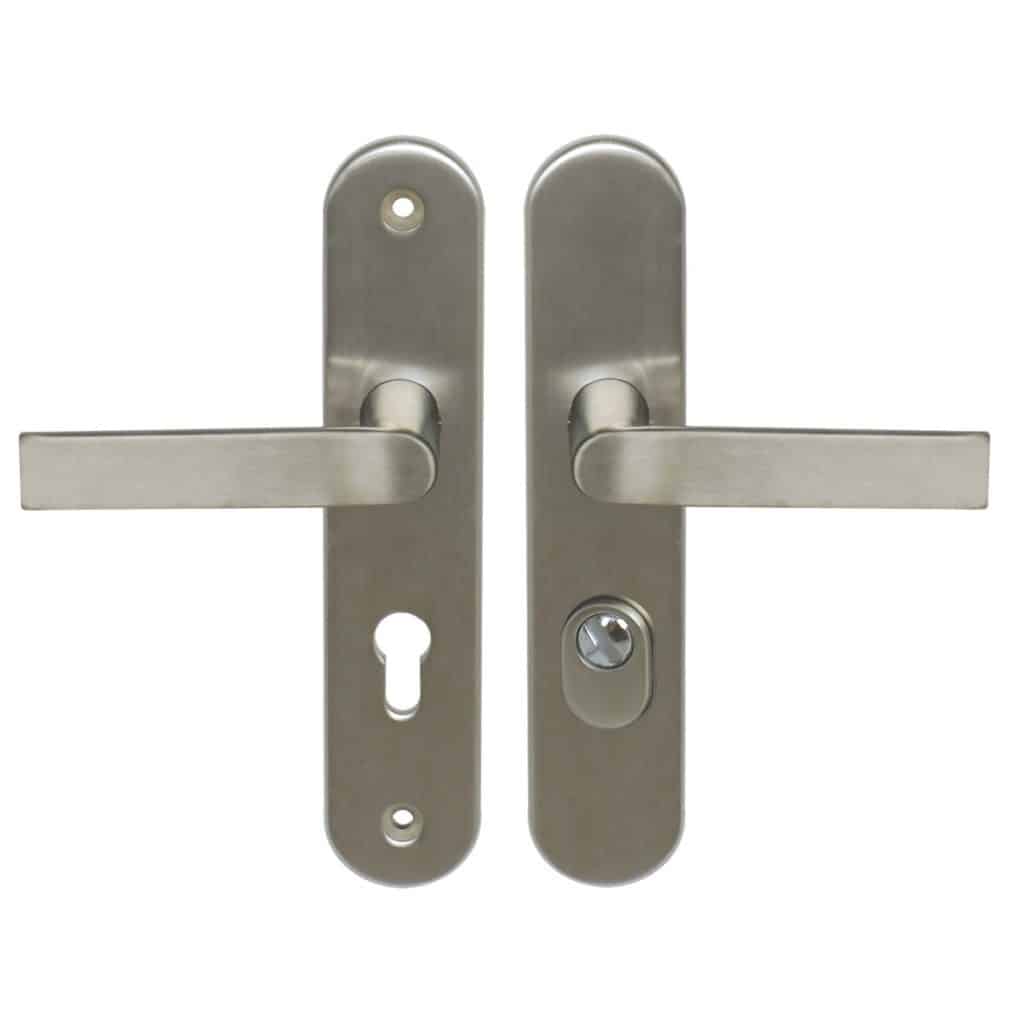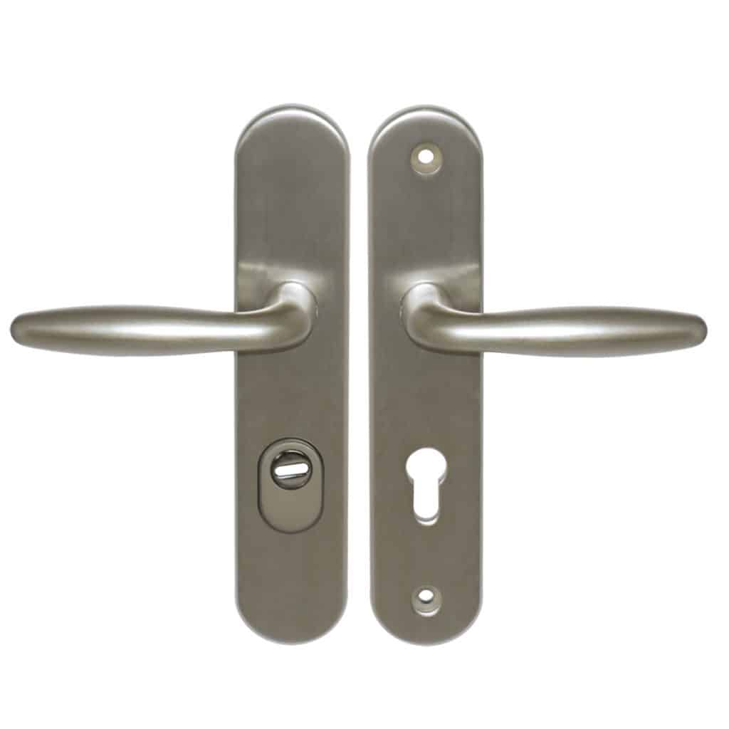 côté extérieur d’une poignée mobile assemblée à une  plaque massive (monobloc) de 12mm d’épaisseur avec protecteur de cylindre en acier cémenté anti-perçage auto-ajustable suivant dépassement cylindre