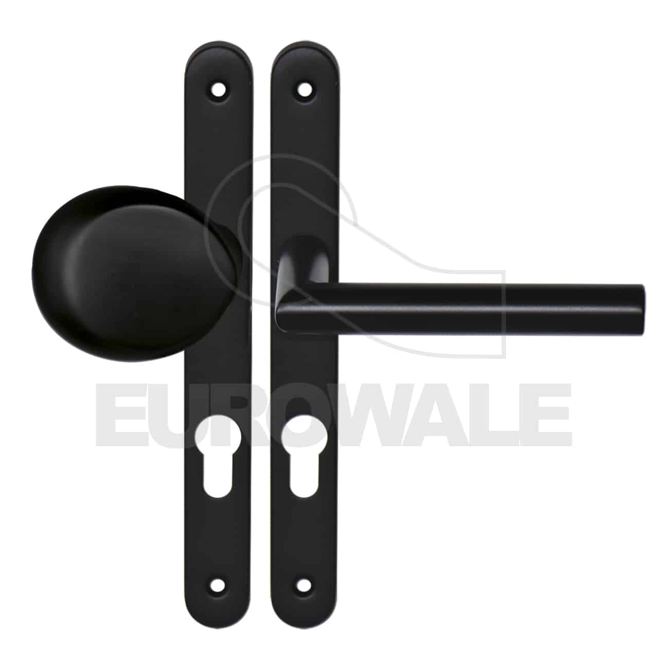 Ensemble palière noir sur plaques étroites (26mm) , composé d’un côté palière Amande massive fixe et de l’autre d’une béquille en angle droit à section ronde sans ressort de rappel sur plaque