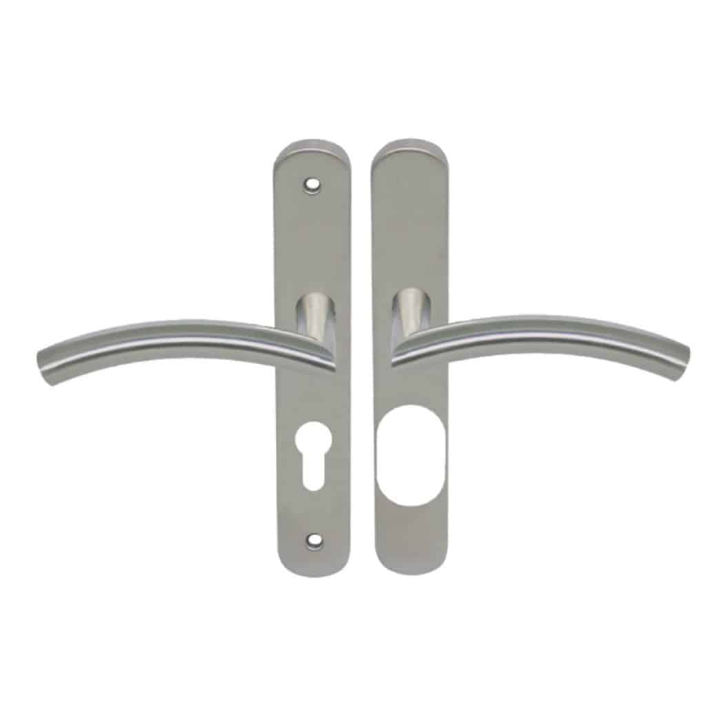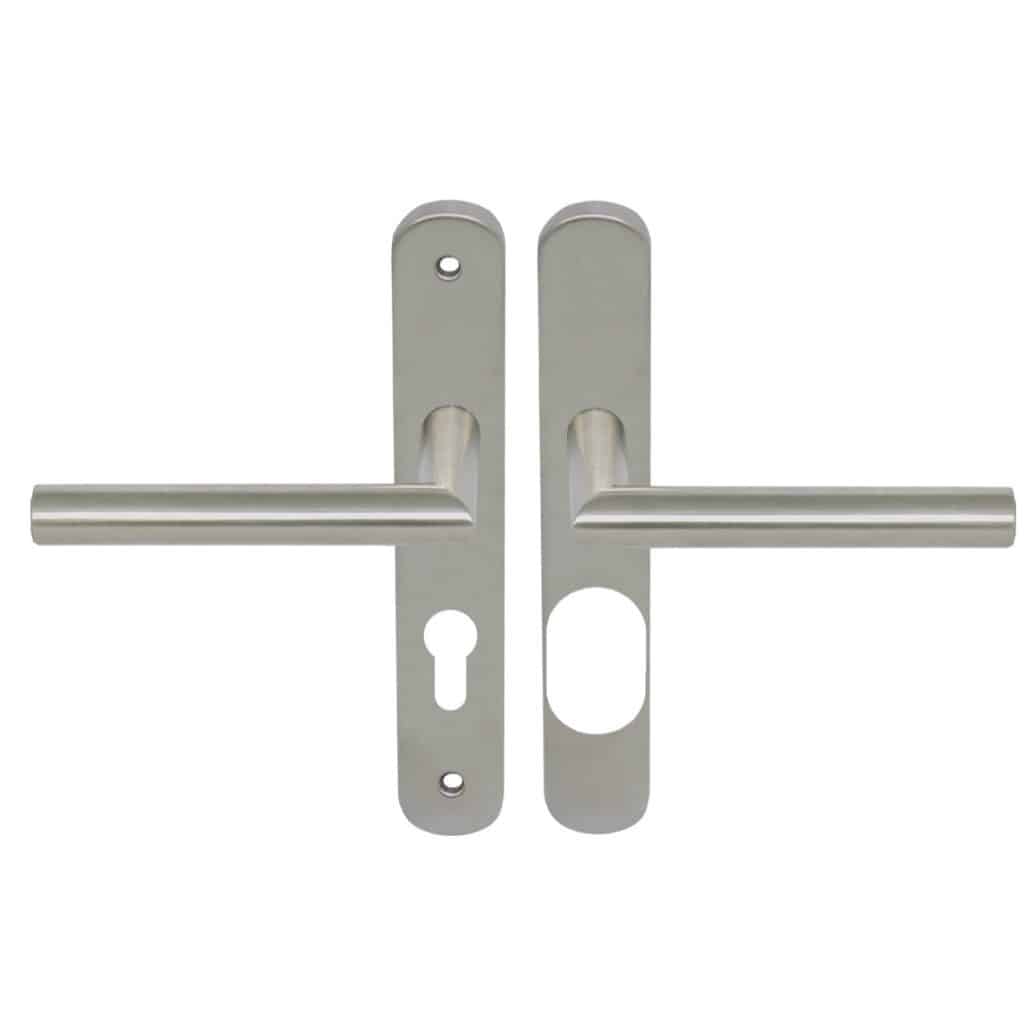Béquilles en inox sans ressort de rappel, d’un côté sur plaque avec trou oblong pour protecteur de cylindre A2P – 2 étoiles, et de l’autre plaque cylindre.