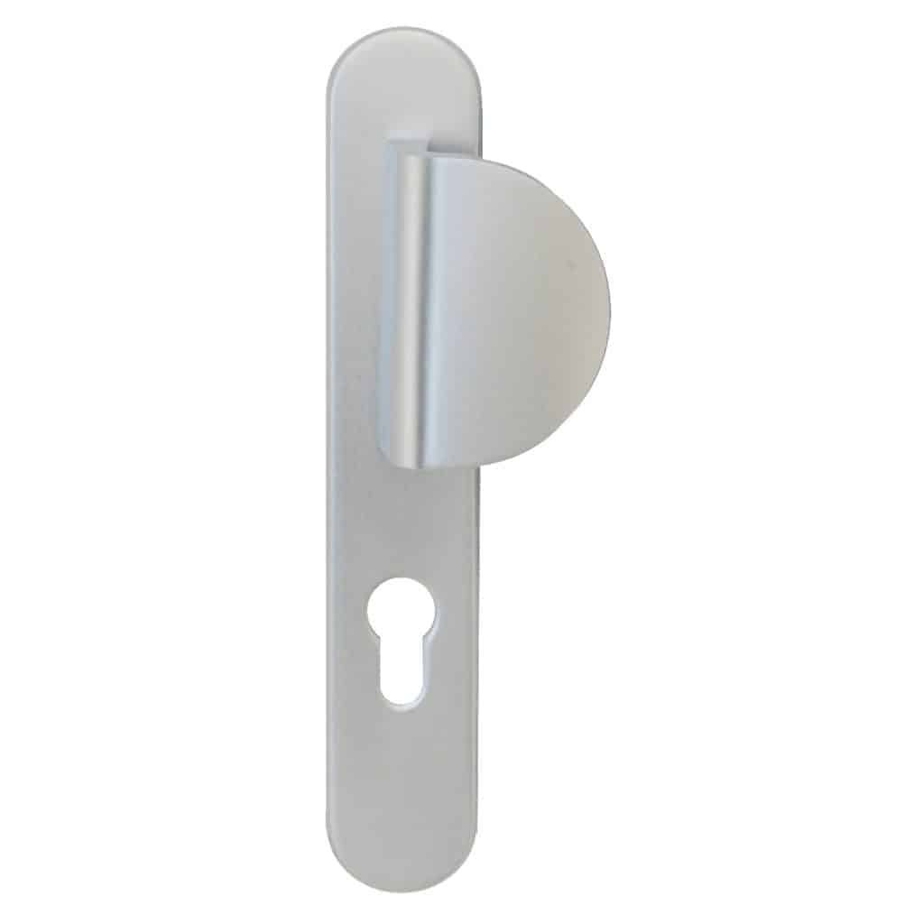 Ensemble de porte alu éco composé d’une béquille sur grande plaque emboutie, ea.195mm, sans ressort de rappel, finition Argent.