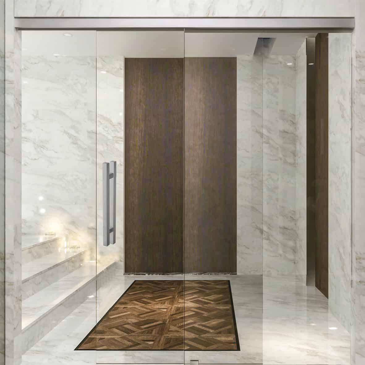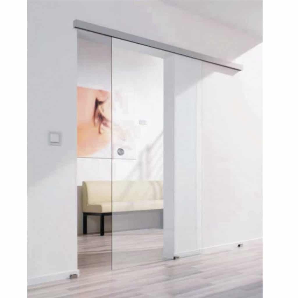 Kit complet en alu argent fixation invisible pour les portes d’intérieur en verre pincées de 8 à 10mm d’épaisseur, de plus de 750mm de large, jusqu’à 80kg.