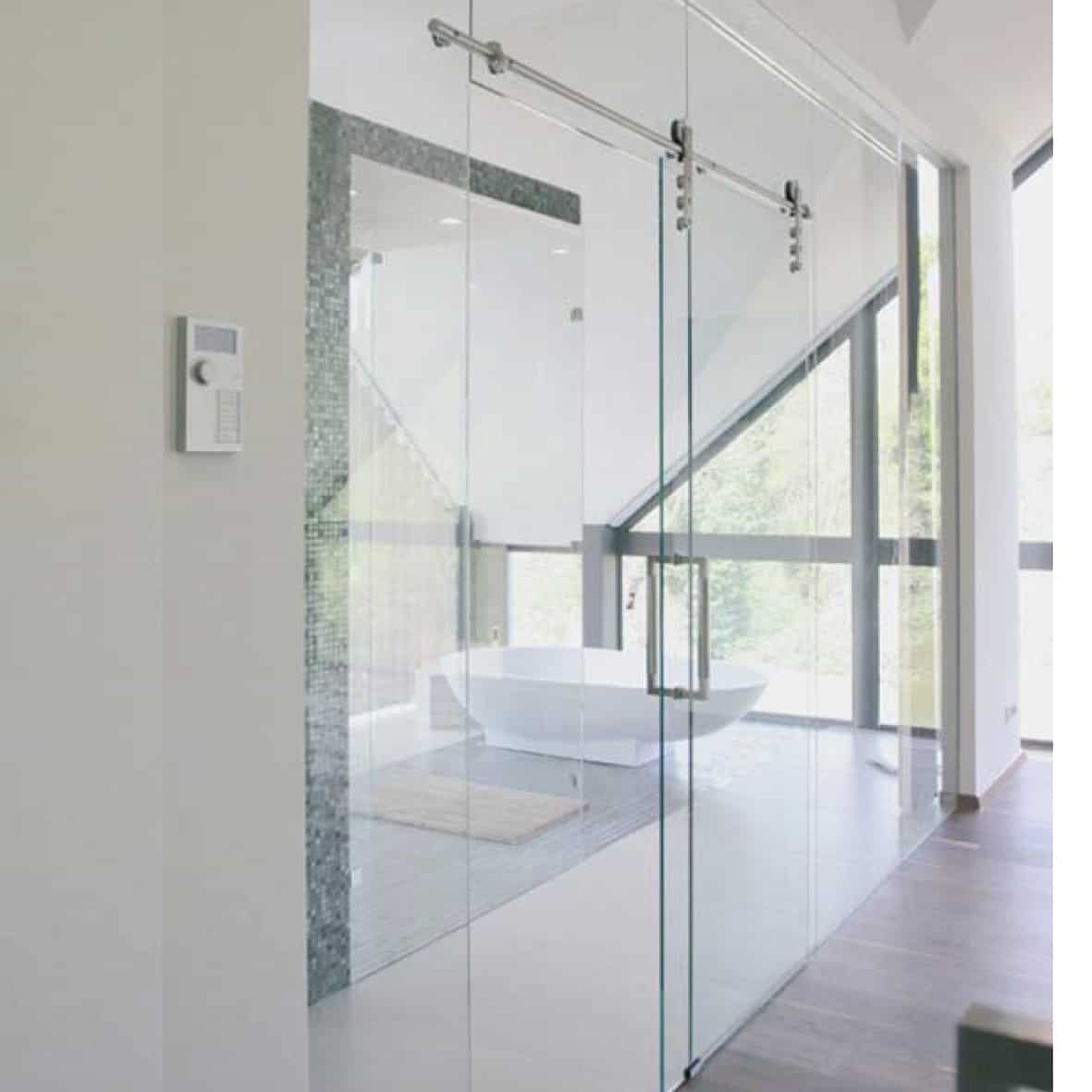 Kit coulissant sur rail inox rond pour porte en verre