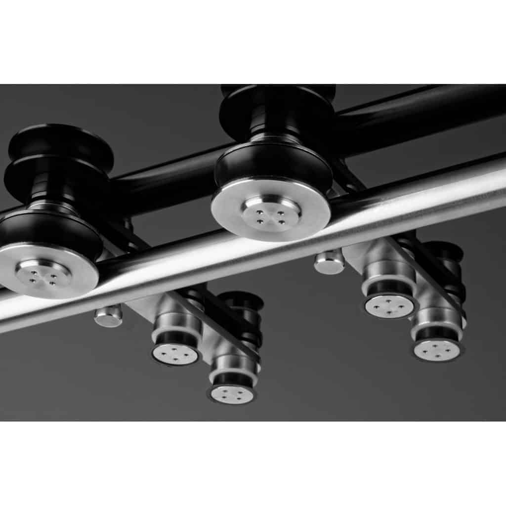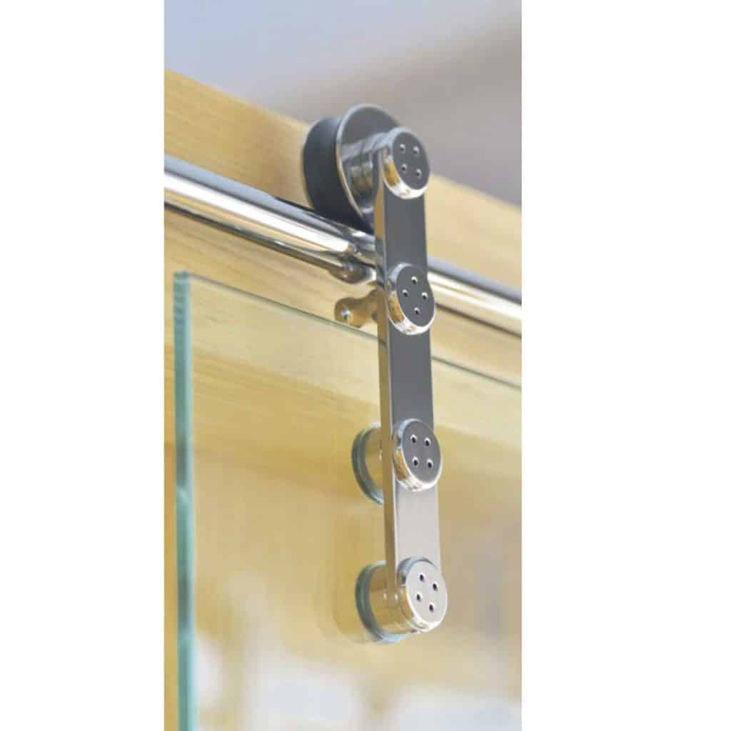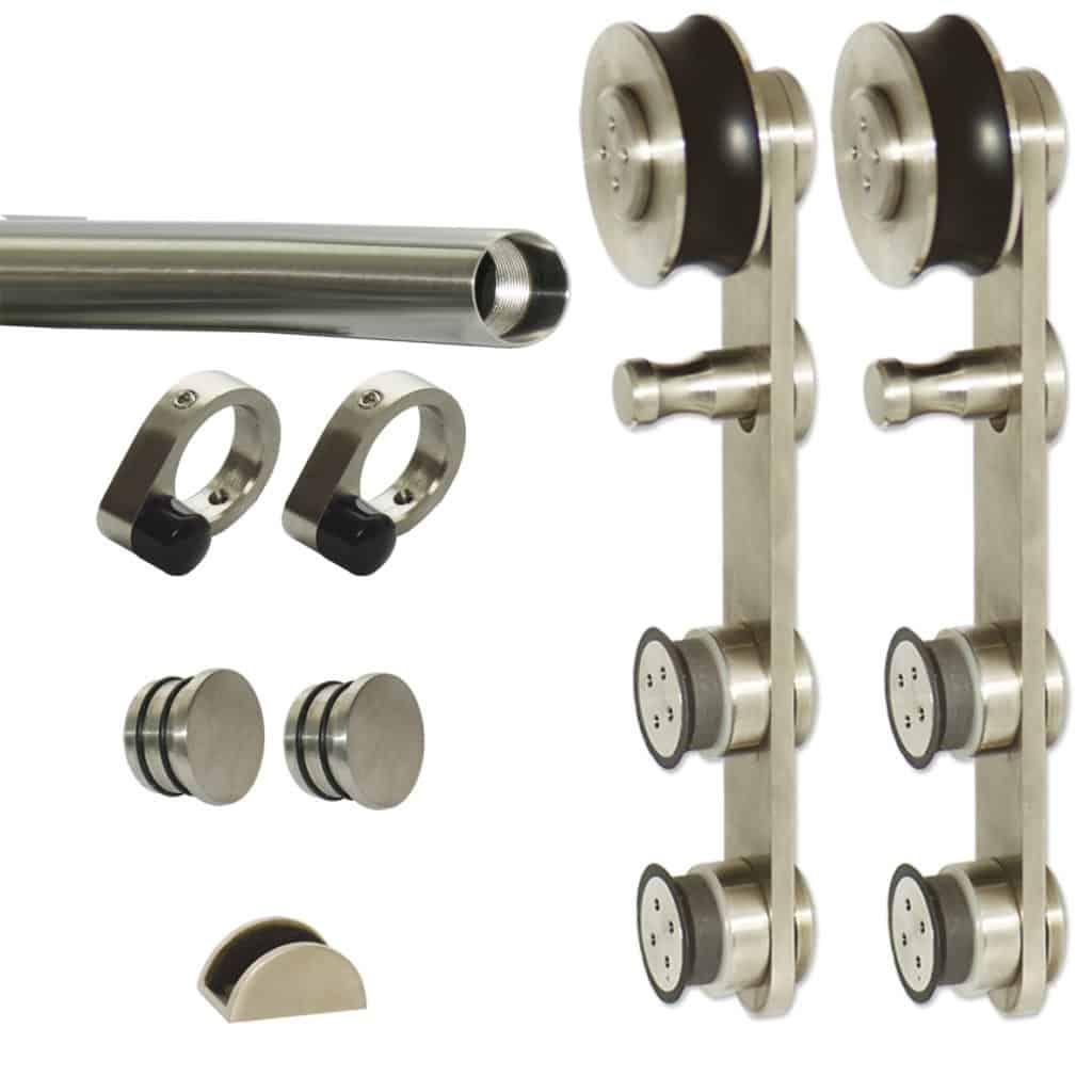 Kit coulissant sur rail inox rond visible et décoratif  pour portes en applique en verre de 8 à 12 mm d’épaisseur, de 730 à 1100mm de large, jusqu’à 60kg.