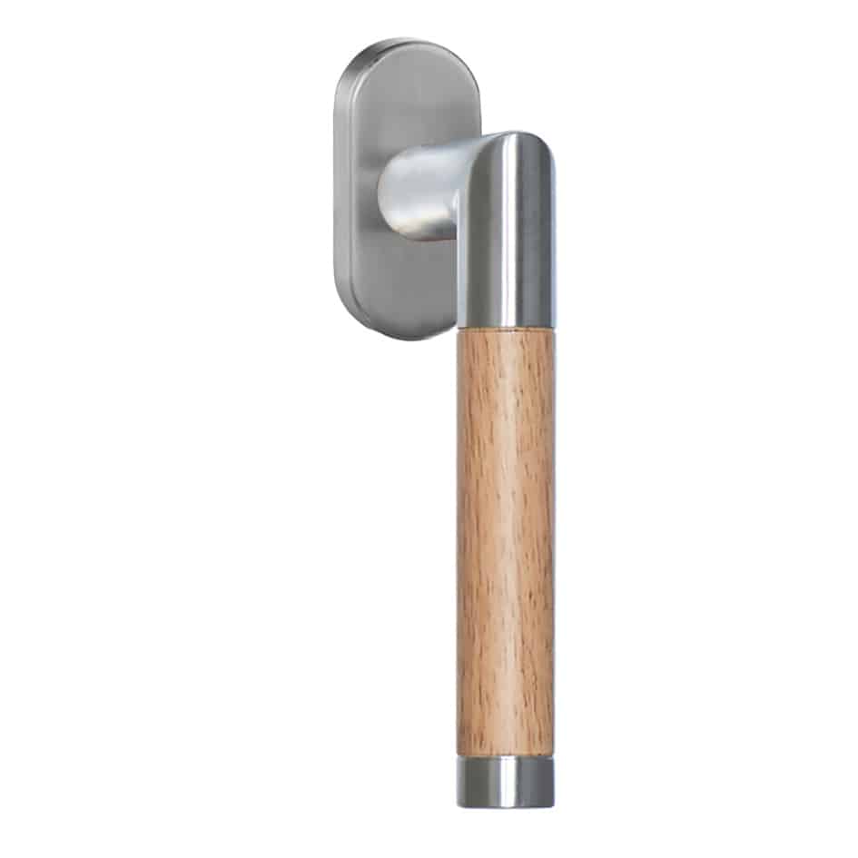 Poignée de fenêtre en inox brossé et aspect chêne ultra résistant.