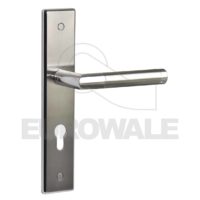 Ensemble décoratif en inox bicolore (brossé et chromé) pour portes d’entrée,  composé d’une béquille tubulaire, montée avec un ressort de rappel sur une grande plaque en fonte massive (de 2mm d’épaisseur).
