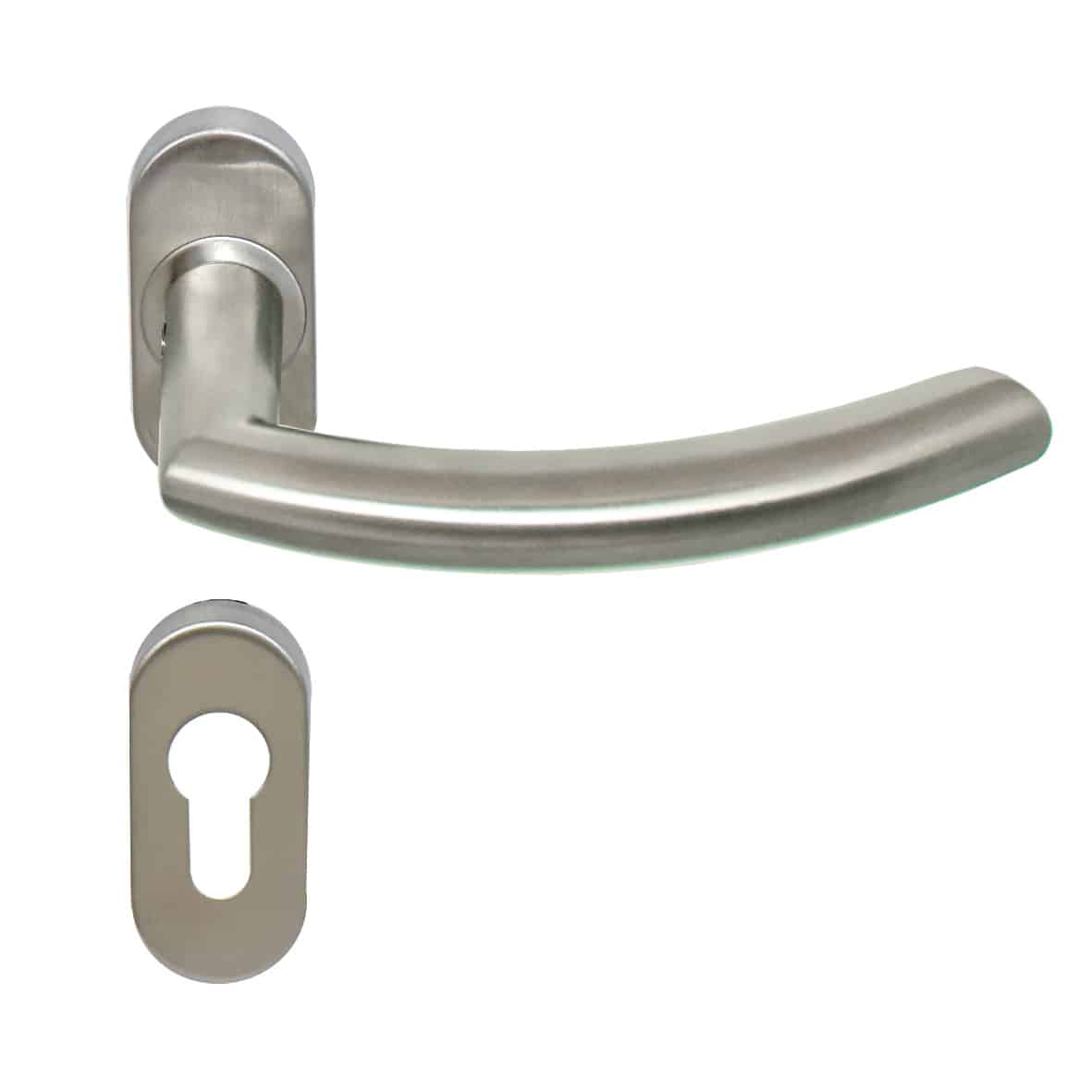 Poignée pour profil étroit  sur rosace ovale à section ronde légèrement cintrée vers l’avant  adaptée aux portes d’entrée et fenêtres coulissantes en alu.