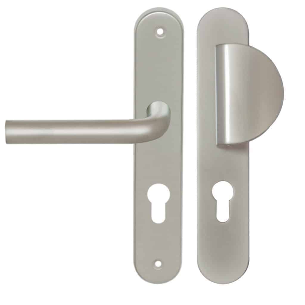 Poignée de porte en aluminium coudée à section ronde, sans ressort de rappel, sur grande plaque ea.195mm.