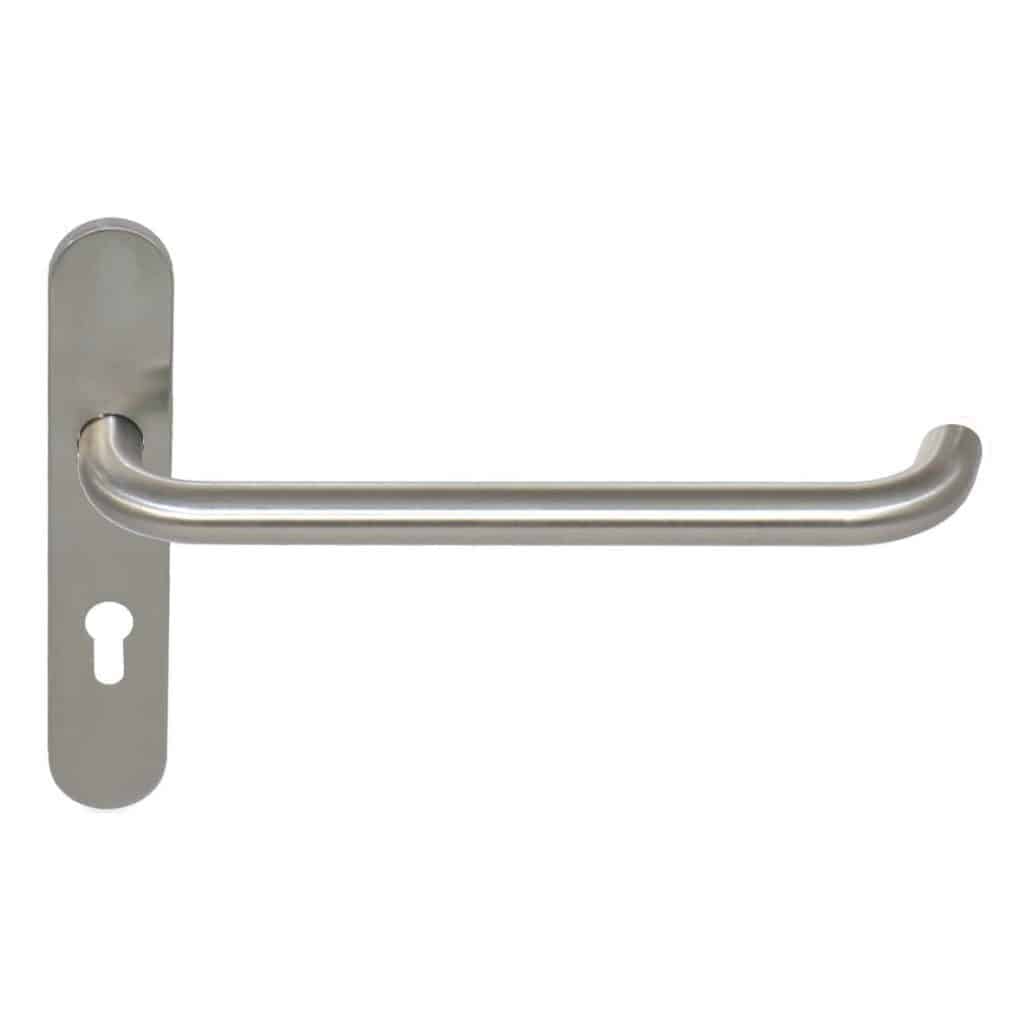 Béquille longue en inox coudée, avec ressort de rappel renforcé, sur plaque ea.195 avec sous construction, vis invisibles.