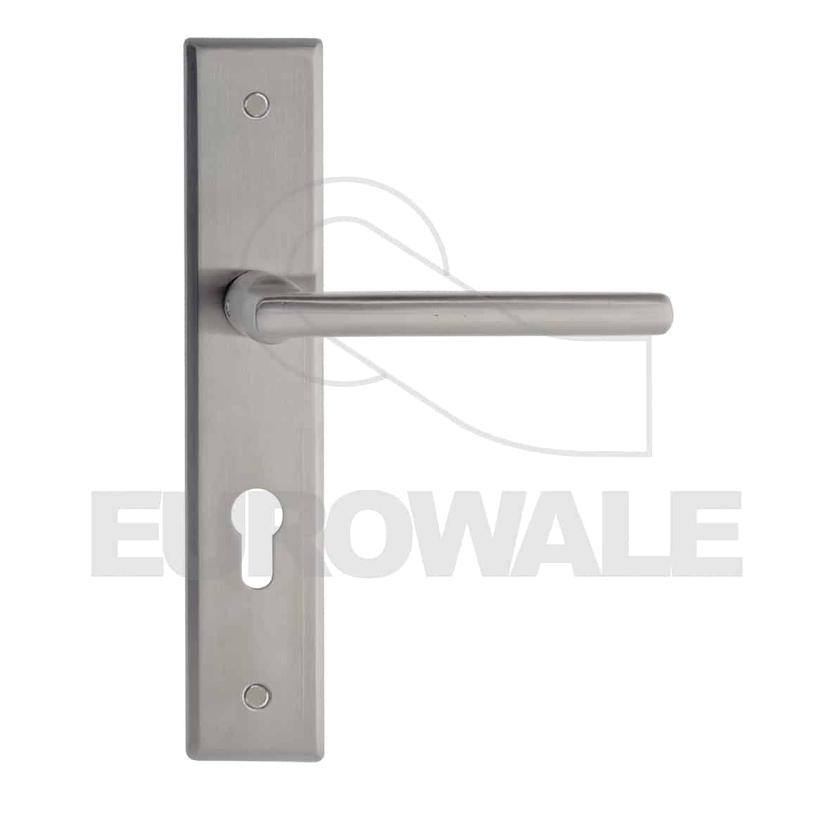 Ensemble décoratif en inox brossé mat pour portes d’entrée,  composé d’une béquille à section rectangulaire sans ressort de rappel,  sur une grande plaque en fonte massive (de 2mm d’épaisseur).
