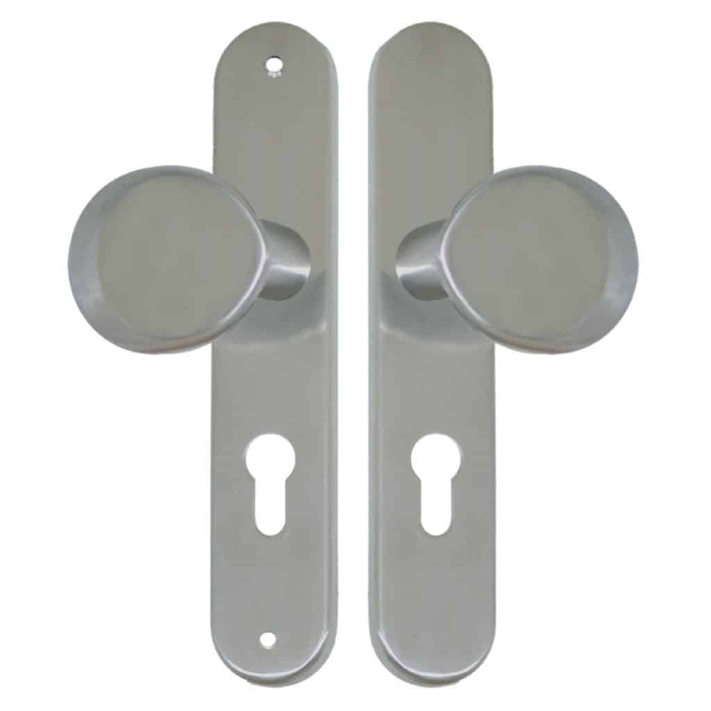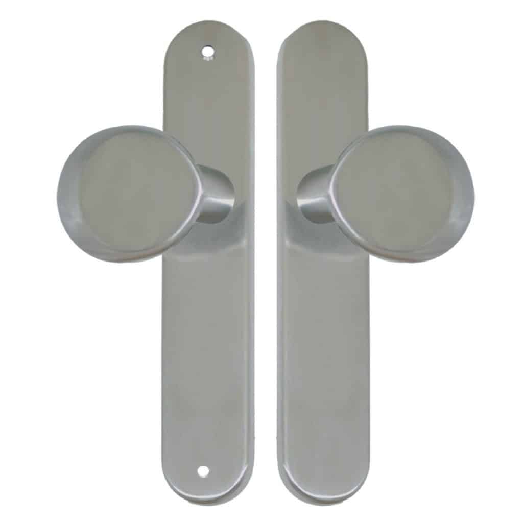 Poignée palière massive en inox sur plaques massives ; ensemble double palière ou palière seule compatible avec nos ensembles inox ea.195mm entraxe 70 et 92