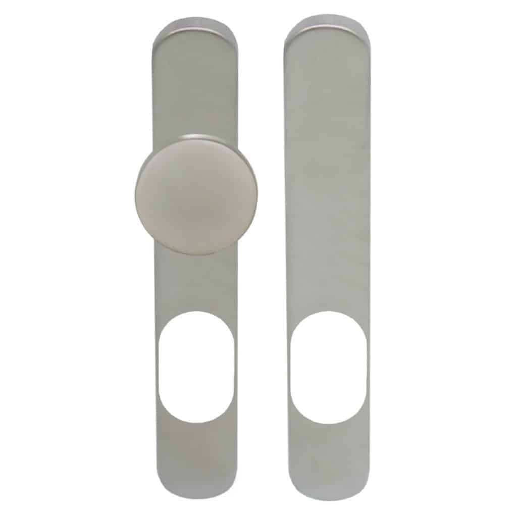 Plaque inox avec ou sans poignée bouton, trou oblong pour protecteur de cylindre A2P-2 étoiles, compatible avec tous nos ensembles inox