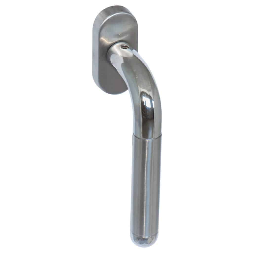 Poignée de fenêtre en inox bicolore brillant et mat, sur rosace ovale.