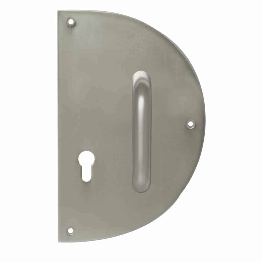 Poignée fixe coudée sur plaque demi-ronde alu en aluminium anodisé argent.
