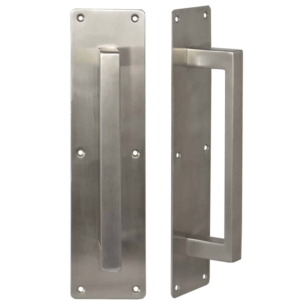 La poignée en inox à section rectangulaire est fixée sur une plaque rectangulaire fine .