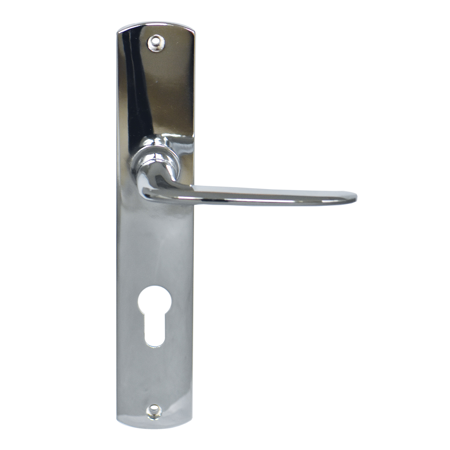 Ensemble de porte éco finition chrome brillant, composé d’une béquille sur grande plaque fondue, ea. de fixation 195mm, sans ressort de rappel.