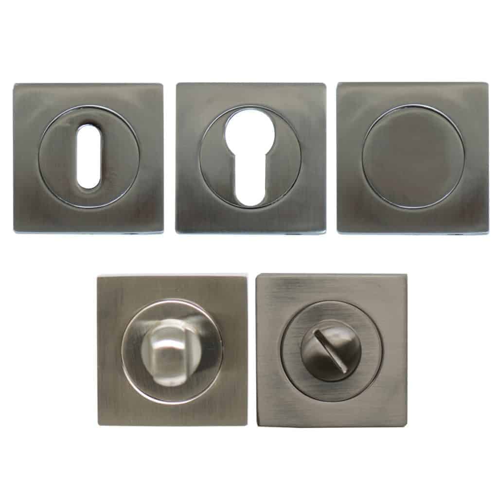 Rosace décorative carrée Nickelée mat, clipsée sur sous-rosace en fonte et maintenue par vis pointeau.