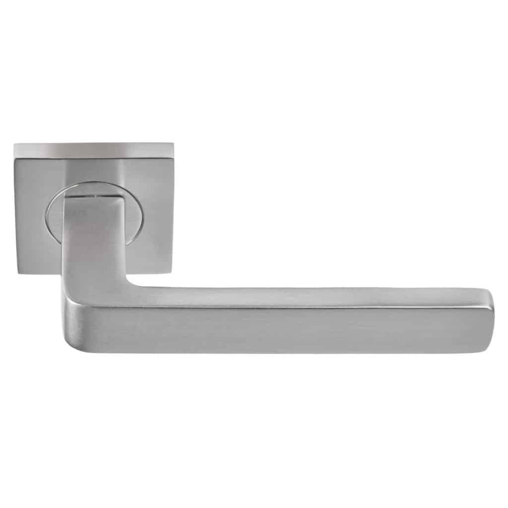 Poignée de porte décorative en Aluminium Finition Inox, composée d’une béquille coudée à section rectangulaire montée avec ressort de rappel sur rosace carrée.
