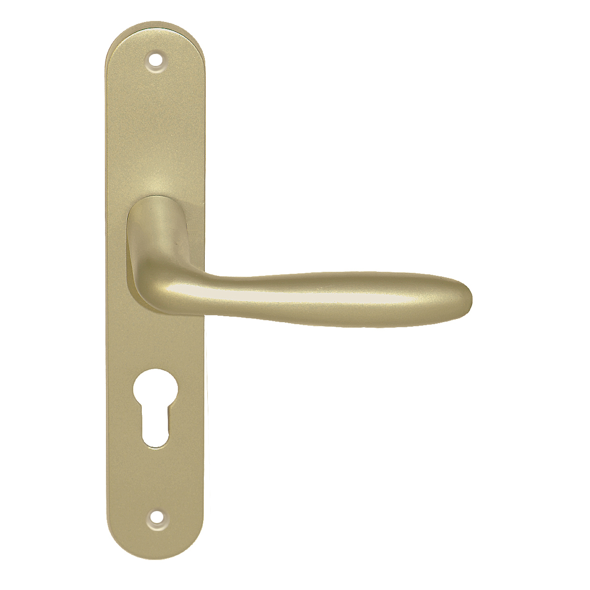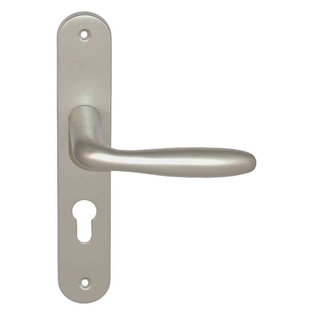 Ensemble de porte pour portes d’entrées moulurées de 38 à 42 mm d’épaisseur , avec béquille réhaussée d’1 côté sur grande plaque ea.195mm.