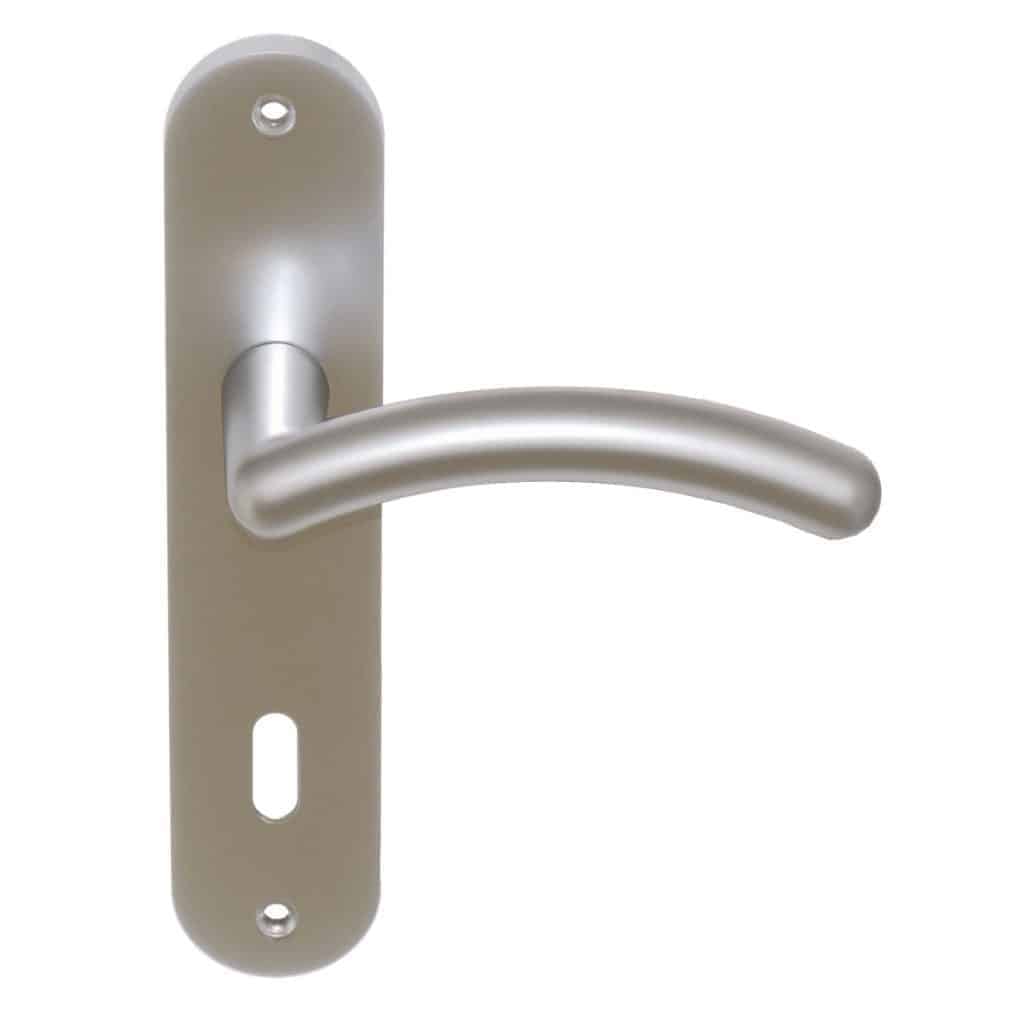 Poignée de porte à section en forme de demi-lune, avec ressort de rappel sur petite plaque ea.165mm.